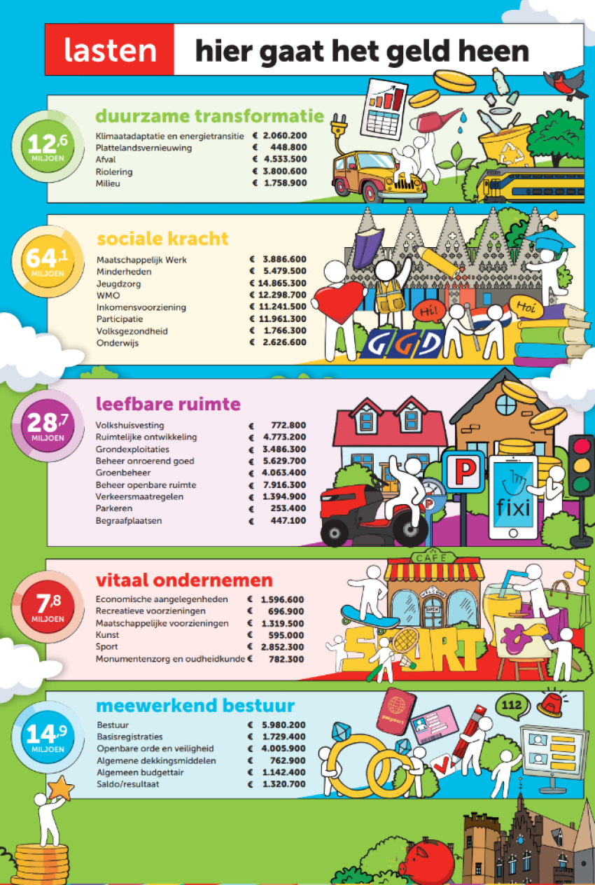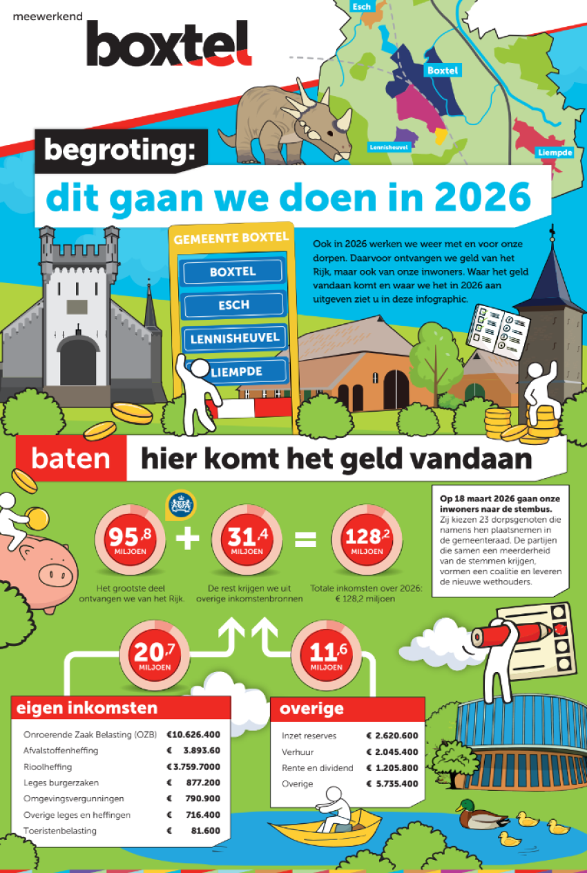Verder heeft de gemeente budget beschikbaar gesteld voor de renovatie van de bibliotheek. Zoals afgesproken in het beleidsakkoord ‘Samen aan de slag’ stijgt de onroerendezaakbelasting (ozb) niet in 2026, afgezien van de inflatie (2,9 procent). Waar de gemeente het geld volgend jaar precies aan uit gaat geven staat in de infographic over de begroting 2026. Zie hieronder:
