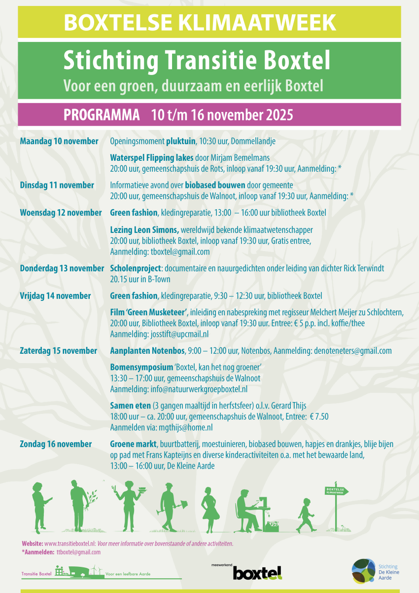 - Als je wil deelnemen aan een of meerdere activiteiten, meld je dan aan via het e-mailadres dat bij de activiteit vermeld staat. Meld je dan aan onder vermelding van de naam van de activiteit(en) of meld je aan via de website van Transitie Boxtel.