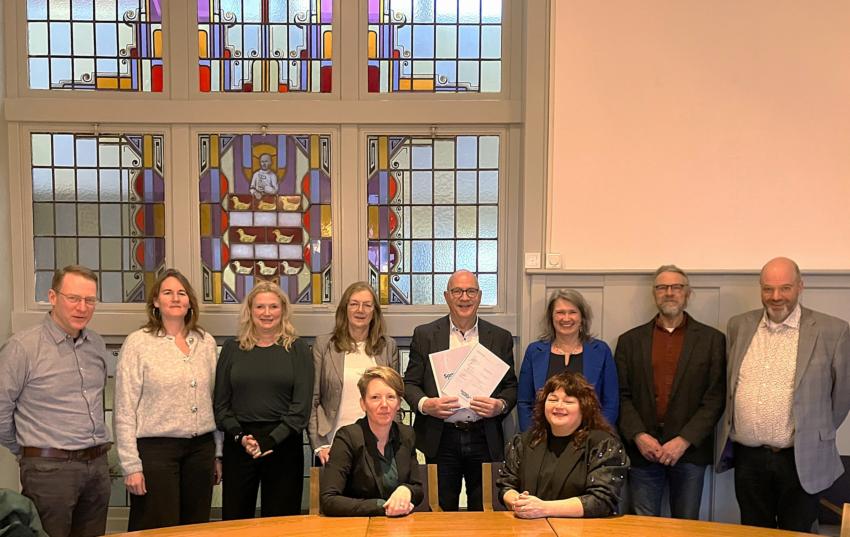 Onderschrift foto van link naar rechts: Johan Klunder (ContourdeTwern), Marina Simons (WSD), Floor van Berkel (ContourdeTwern en R-Newt), Elly van Hoof (Huis73), Fred van Nistelrooij (wethouder Boxtel), Rian van de Schoot (MEE De Meent Groep), Lex Meijdam (BSB), Johan (teammanager gemeente Boxtel). Zittend: Mariëlle (projectleider gemeente Boxtel), Manon Clarke (MEE De Meent Groep).